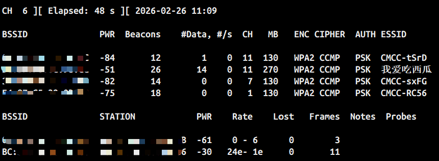 ★扫描当前周边环境的WiFi信号airodump-ng wlan0mon --band abg