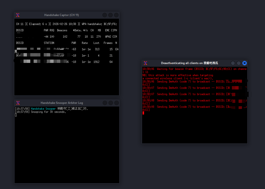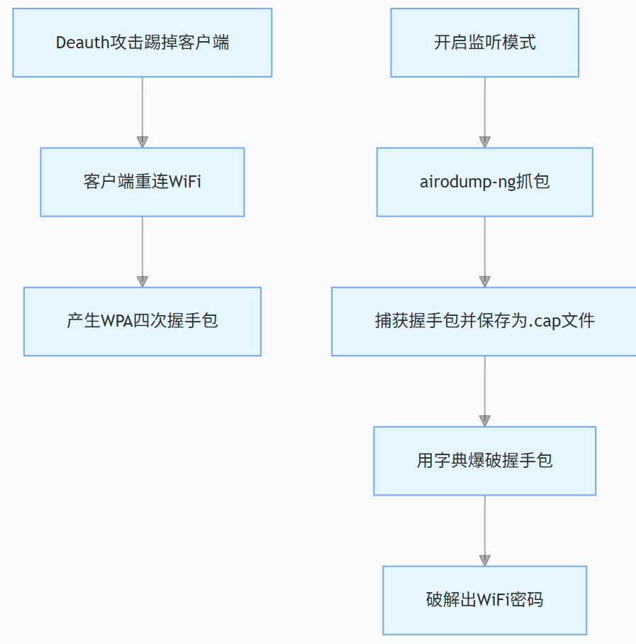 - 密码爆破:通过 Deauth 攻击逼客户端重连,捕获 WPA 四次握手包,再离线字典破解 WiFi 密码。