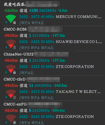★但是我发现现在家用WiFi大多都为2.4Ghz的频段,因为2.4Gh频段波长长,穿墙能力好,范围大,但是这恰恰让它在安全上更脆弱,更容易被 DeAuth 攻击和抓包破解。下边的都为2.4Ghz频段的WiFi(一句话太脆弱了)而5Ghz频段虽然网速快,但是穿墙性能差,设备要求高,但是5Ghz更加安全不容易被DeAuth 攻击和抓包破解因为5Ghz频段的信道多干扰小。