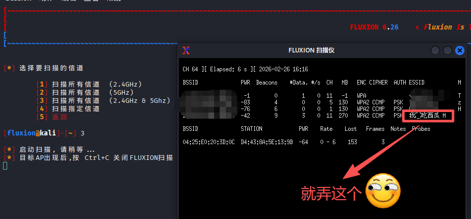 ★进入目录执行shell脚本文件并且选择2然后选择3扫描全部信道./fluxion.sh