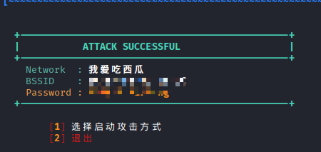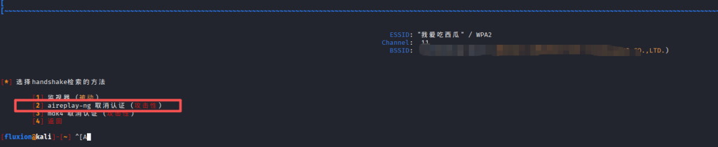 ★实质还是使用解除认证(Deauthentication)攻击,然后抓到握手包,然后选择1,继续选择1